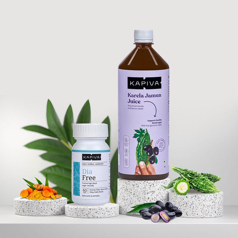 A powerful Ayurvedic combo to manage the modern lifestyle disease of diabetes. The pack contains Kapiva Karela Jamun Juice and Dia Free Capsules to manage blood sugar levels and regulate carbohydrate metabolism.