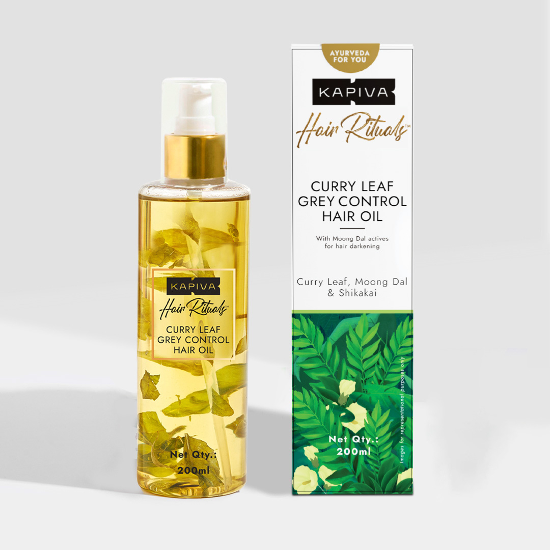 Kapiva Curry Leaf Grey Control Hair Oil, infused with curry leaves, shikakai and clinically tested moong dal actives, which increases hair pigmentation leading to visibly darker hair.