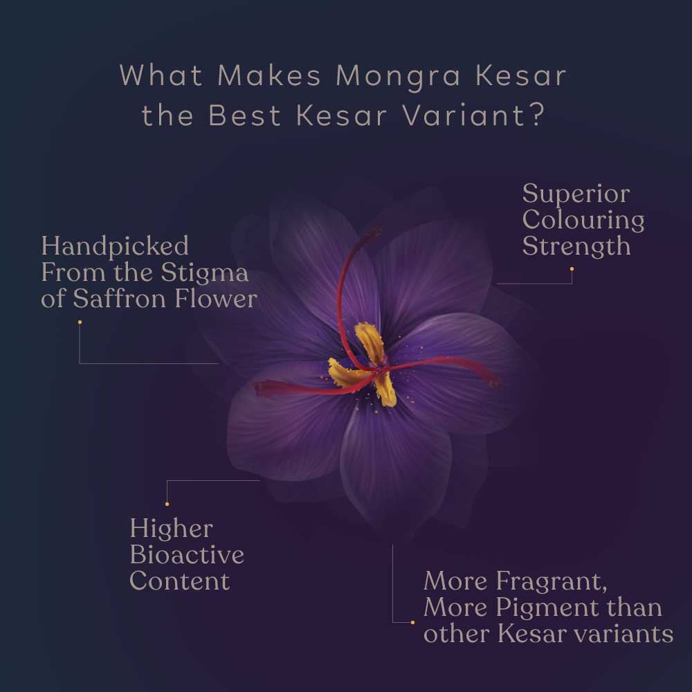100% original, pure and handpicked Mongra Kesar from the lush fields of Pampore, Kashmir. We use Mongra Kesar which is more efficacious than Lacha saffron. From enhancing your beauty, strengthening your immunity to improving cognitive functions, this pure saffron spice does a wealth of good to your holistic health and wellbeing.