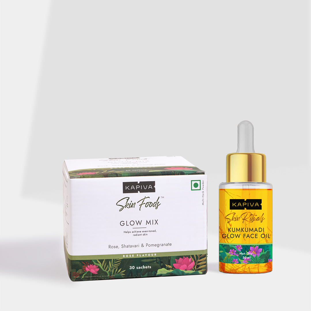 Skin Foods Glow Mix & Kumkumadi Glow Oil, a one of a kind skincare combo that aims at nourishing skin from inside out, with the goodness of Rose, Pomegranate, Shatavari in Glow Mix & goodness of Kumkumadi Tailam for ultimate skin glow! Get Visible Glow in just 15 Days!
